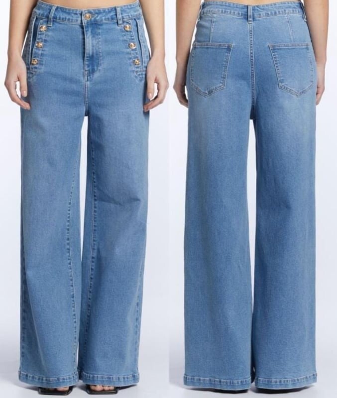 De jeans is uitgevoerd in een soepele wassing en heeft gouden sierknoopjes en zakken.