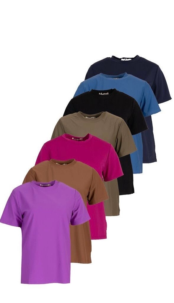 Details: Het t-shirt is gemaakt van een travel stof. Dit betekent dat de stof glad is en dat je deze niet hoeft te strijken na het wassen. Ook zit er elasticiteit in de stof, waardoor het iets weg heeft van een recht/getailleerd model. De hals van het t-shirt is hoog en rond, en er zitten kleine splitjes aan de zijkanten van de onderkant van het t-shirt.